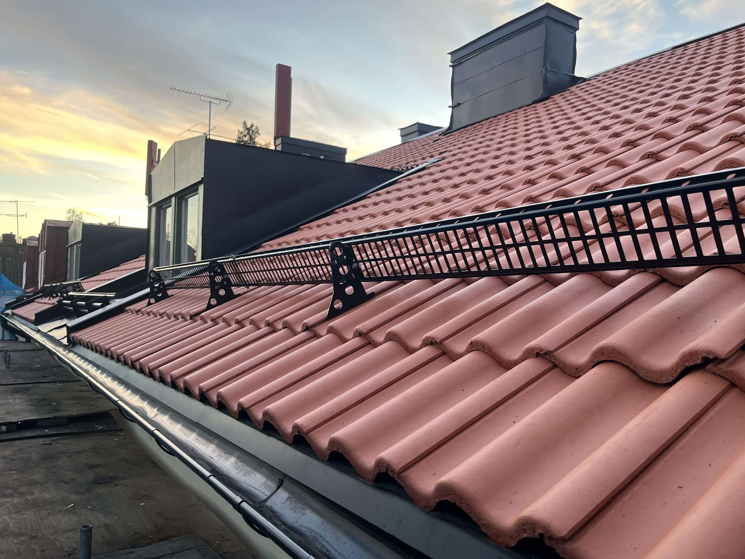 För säkerhet och trygghet på ditt tak. Vi installerar snörasskydd, gångbryggor, takstegar och annan taksäkerhetsutrustning för att minska olycksrisken vid arbete och snöfall